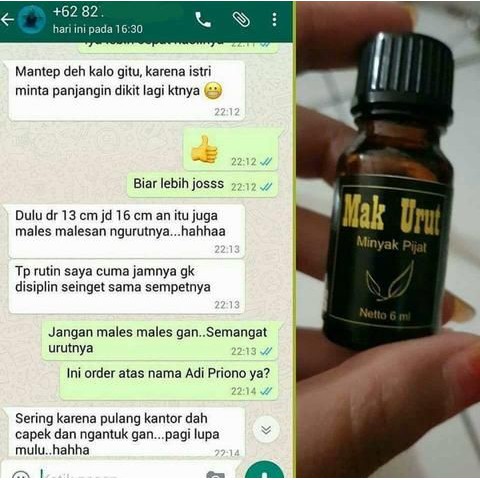 Mak Urut merupakan minyak pijat dari PT. MANFAAT MAK URUT NASA UNTUK PENIS Membuat penis sehat bersih dan terawat Menjadikan penis besar panjang dan tahan lama Membuat penis kuat dan perkasa Menjadikan penis ereksi maksimal Menjadikan penis selalu pengin berhubungan Menjadikan hubungan dari 5 menit menjadi 5 ronde Membuat sperma lebih berkualitas Testimoni Mak Urut. Dengan melakukan beberapa latihan rutin disertai penggunaan Mak URUT yang tepat akan membantu memperbesar dan memperpanjang alat vital pria.