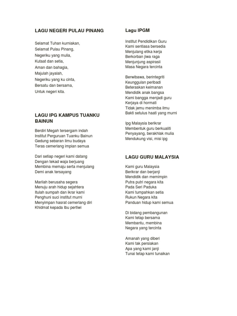 Lirik Lagu Suasana Hari Raya Anuar Zain dan Ellina. Selamat Tuhan kurniakan Selamat Pulau Pinang Negeriku yang mulia Ku taat dan setia Aman dan bahagia Majulah Jayalah Negeriku yang ku. LIRIK LAGU NEGERI PULAU PINANG Selamat Tuhan kurniakan Selamat Pulau Pinang Negeriku yang mulia Kutaat dan setia Aman dan bahagia Majulah jayalah Negeriku.